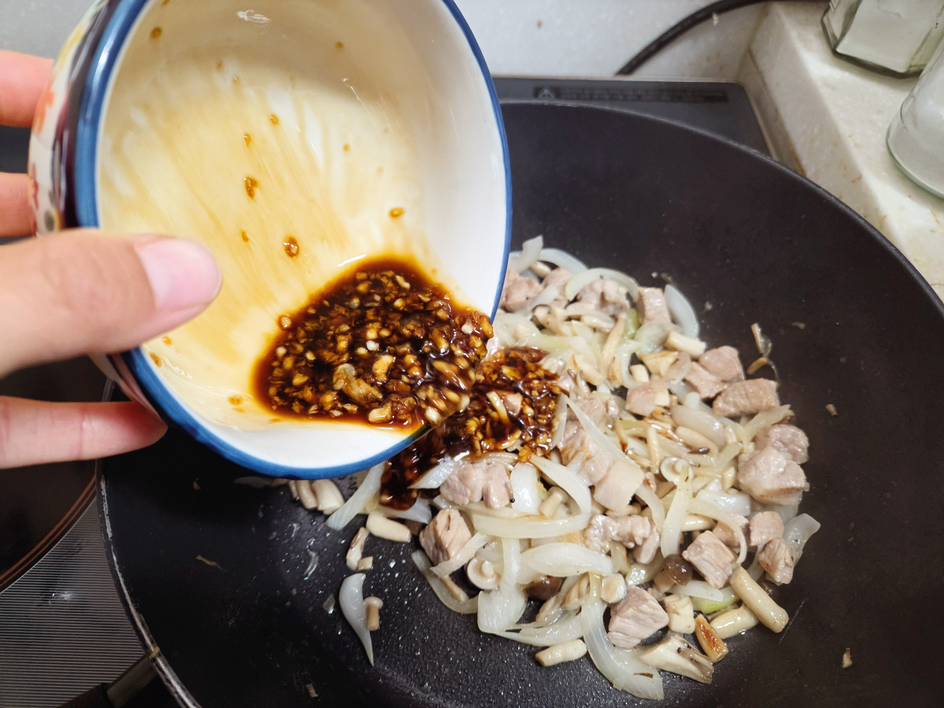 6. 고기가 익기 시작하면 양파, 만가닥버섯을 넣고 함께 볶는다.