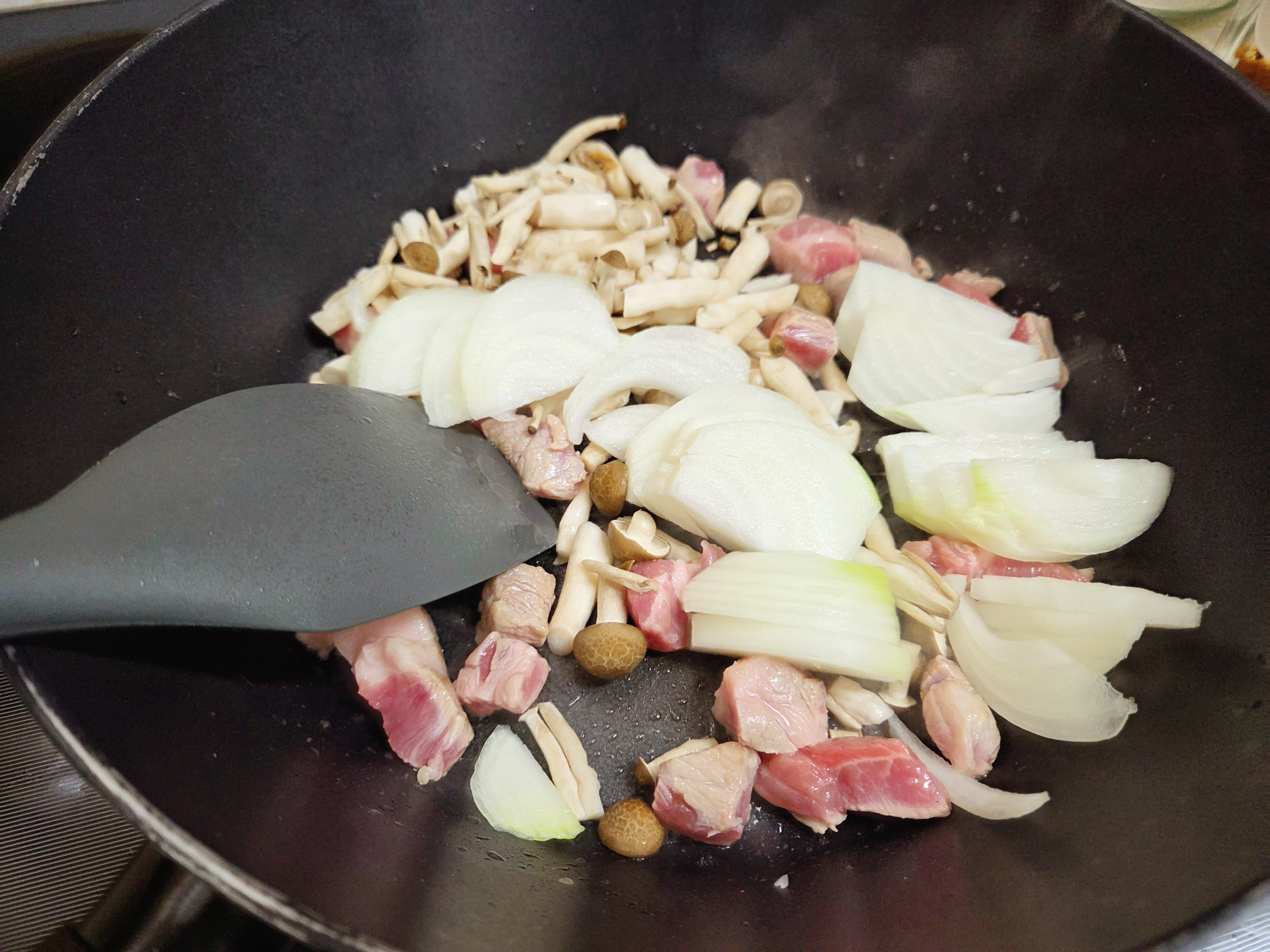 4. 돼니목살을 넣고 익히다가 양파, 버섯을 넣고 함께 볶는다.