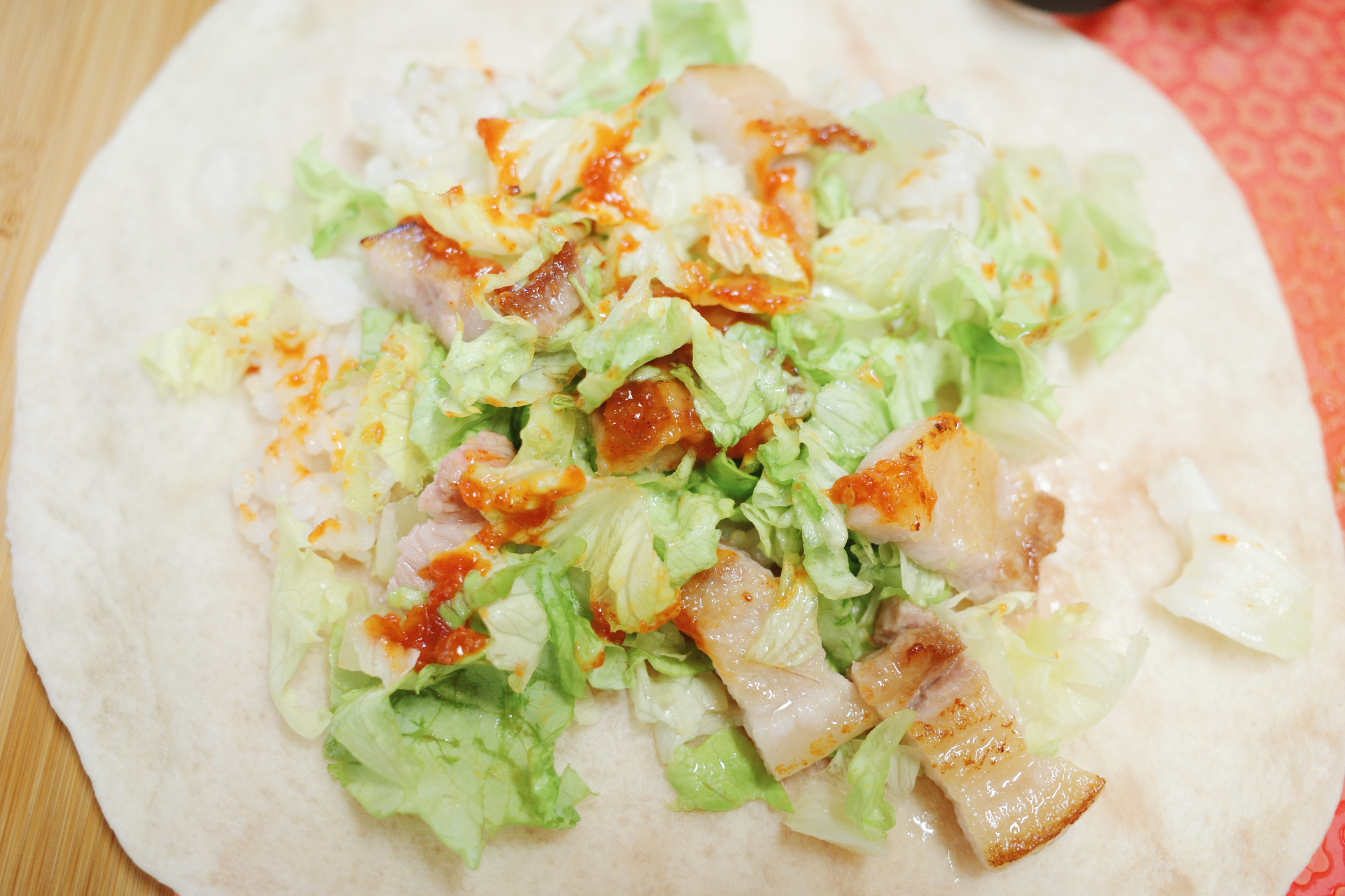 주방에서 자주 만나는 삼겹살과 쌀밥에 또띠아를 더해보니 어떠신가요? 흔한 재료가 색다른 요리가 되어 식탁 위에 기분 좋은 변화를 선사하지요? 낯익은 재료도 새로운 조합으로 다시 태어날 수 있습니다.