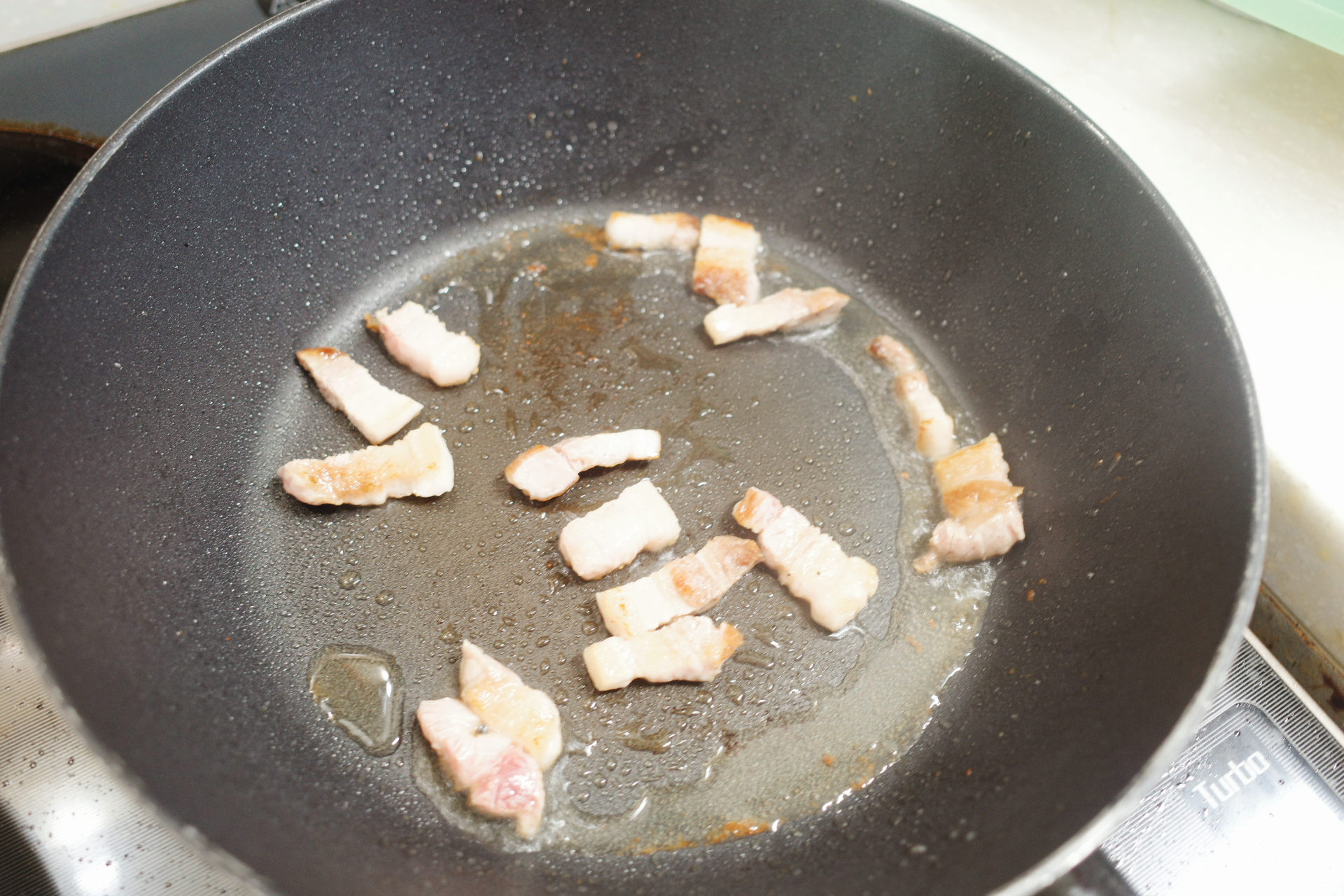 1️⃣ 삼겹살은 한입 크기로 썰어 주세요. 팬을 중불로 달군 뒤 삼겹살을 올려 기름이 충분히 나올 때까지 볶습니다.