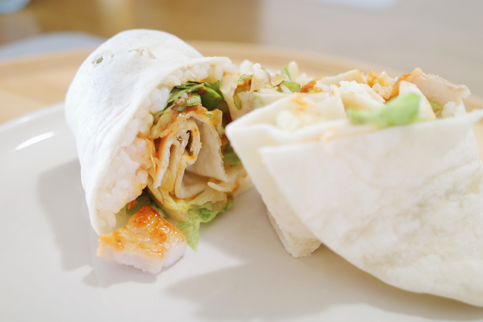 2️⃣ 또띠아 위에 볶음밥을 길쭉하게 올리고 돌돌 말아 김밥처럼 준비합니다.